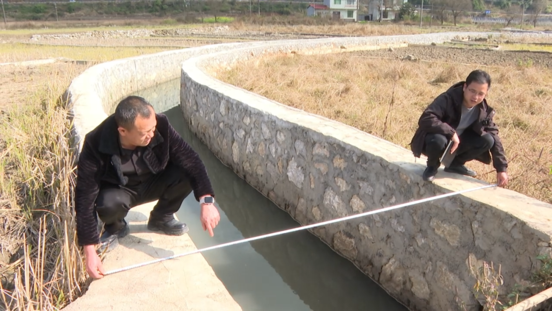 图为黄跃盛(右一)测量沟渠宽度